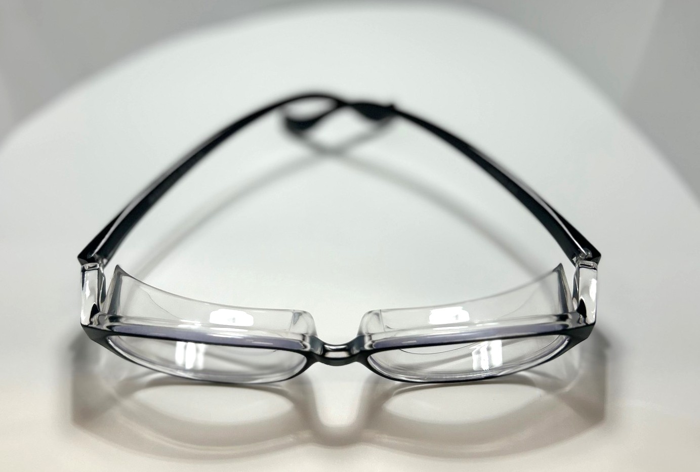 フード付き花粉対策メガネ「スカッシースタイル」。